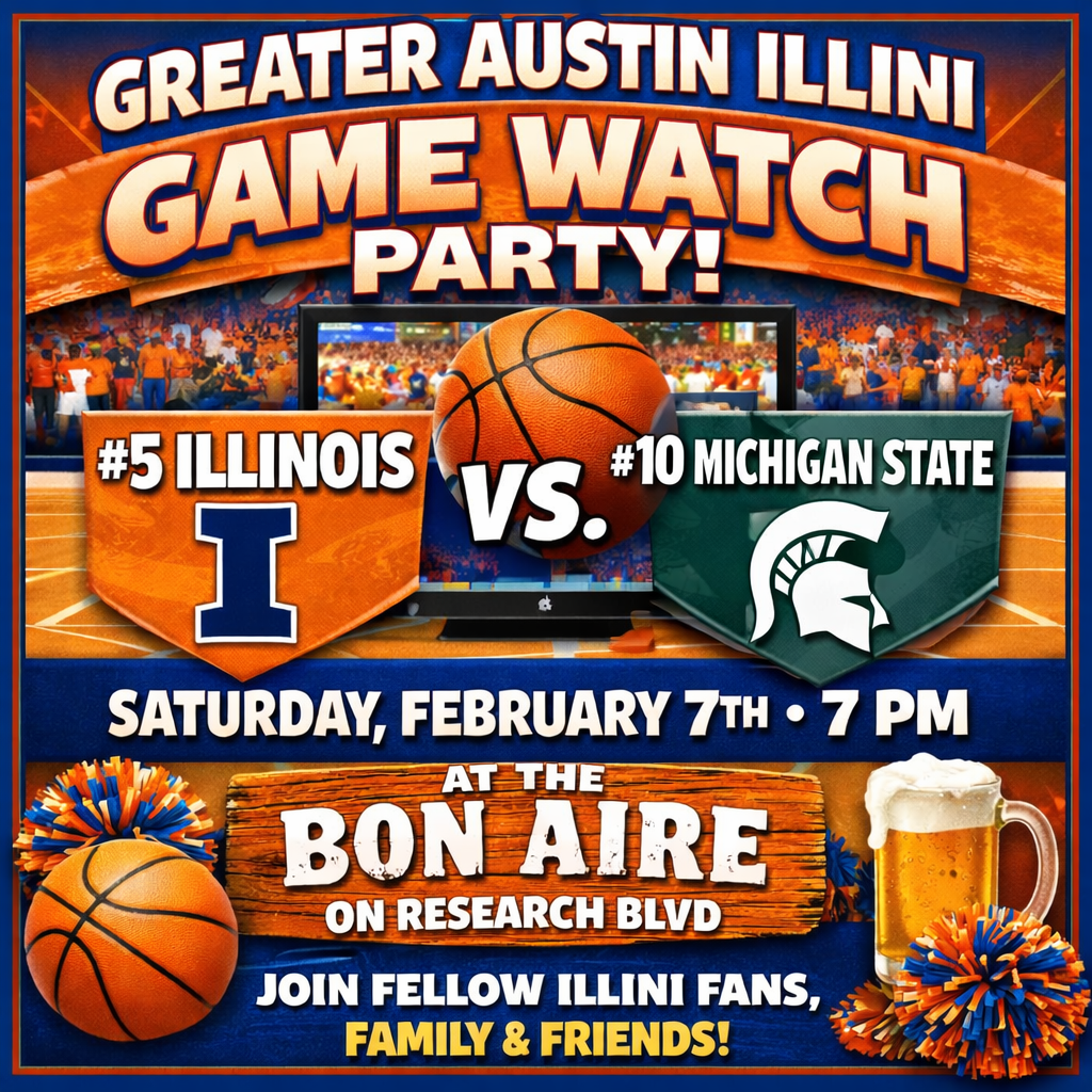 7:00PM - 10:00PM Sat 7 Feb 2026 Central timezoneWe'll watch the game against the 10th ranked Michigan State Spartans at The Bon Aire on Research Blvd! The tables will be ready at 6:30 for anyone that would like to come early. The food is good and there's lots of parking! Come for the fun and camarader -